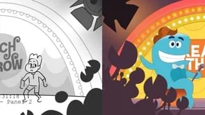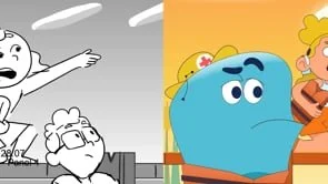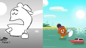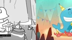 The following are excerpts from four episodes of WHALE Tales, with side-by-side comparison between the Animatic to Final Picture. Several panels are loose and sketchy, reflecting a short turnaround and last-minute swaps of characters in some videos.